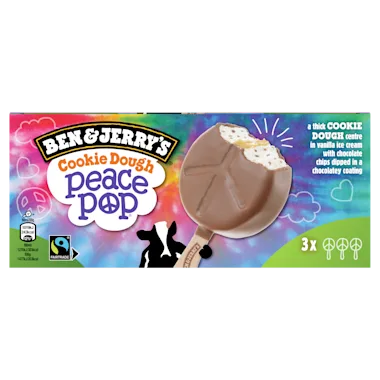 Bij Ben & Jerry's zijn we altijd al bezig geweest met peace, love and ice cream en daarom introduceren we onze Cookie Dough Peace Pops IJsjes. Vanille-ijs bedekt met een heerlijke chocolaag, een cookie dough core en chocolate chips. Het is een geheel nieuwe manier om te genieten van onze (h)eerlijke Cookie Dough classic! De Ben & Jerry's Cookie Dough Peace Pop is ook verkrijgbaar in de supermarkt!