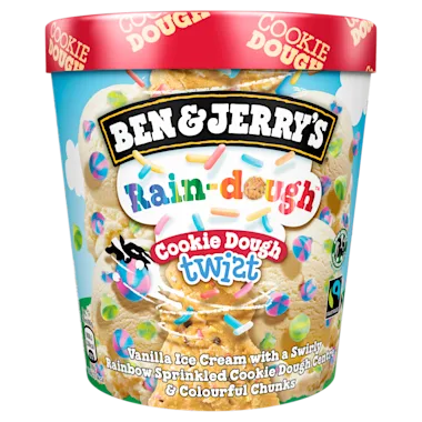 “Vanille roomijs met een twist: een smeuïge Cookie Dough core met gekleurde Chunks. Bereid je voor op een euforische ervaring dat over the Rain-Dough is! Met de Cookie Dough Twist voldoe je aan al jouw Ben & Jerry’s ijs cravings, nu ook met een exciting Cookie Dough core waar Cookie Dough fans helemaal wild van worden!”
