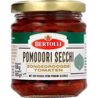 Bertolli wil al het goede uit de Italiaanse keuken toegankelijk maken. Pomodori Secchi/Zongedrogde tomaten op olie is onderdeel van een range Italiaanse groenten. Met deze nieuwe zongedroogde tomaten op olie kleed je in een handomdraai je salade, Italiaanse borrelplank of pizza aan.