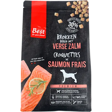 Samenstelling: • Zalm (waarvan 15% verse zalm) • Rijst • Mais • Erwten (10%) • Gevogeltevet • Gedroogde bietenpulp • Biergist • Lijnzaad • Gedroogde johannesbrood • Zalmolie • Eipoeder • Inuline (bron van FOS) • Cranberries (0,1%) • Chondroïtine • Glucosamine.