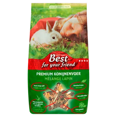 Geef het konijn circa 75 gram Premium konijnenvoer per dag. Vul het bakje pas bij wanneer het bijna is leeggegeten. Zorg altijd voor vers drinkwater. Tip: verschoon de kooi tenminste een keer per week met Best for your Friend zaagsel en/of stro.