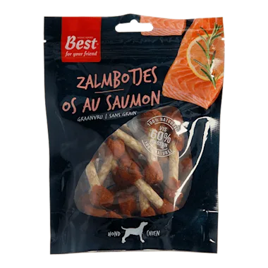Zalmkluifjes van Best for your Friend zijn een hondensnack en geen vervanging voor de dagelijkse complete hondenvoeding. Zet dagelijks voldoende vers water klaar.