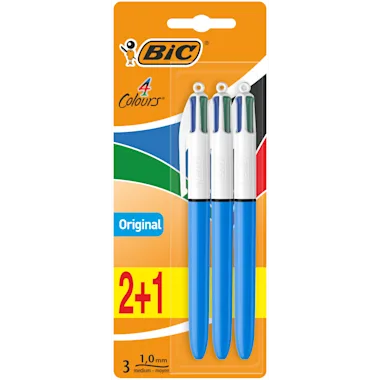 Verander van kleur zonder van pen te wisselen, met de BIC 4 Kleuren Original. 3 pennen met blauwe, zwarte, rode en groene inkt