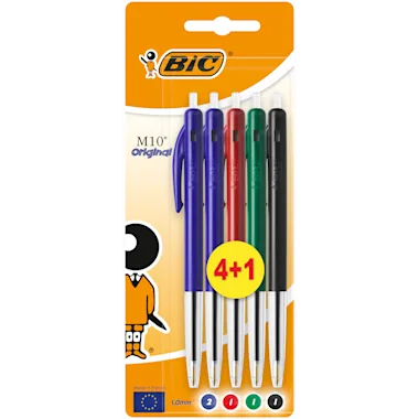 Pak met 4 + 1 gratis M10 balpennen, 2 stuks met blauwe inkt, en 1 stuk met rode, groene en zwarte inkt en bijpassende lichamen