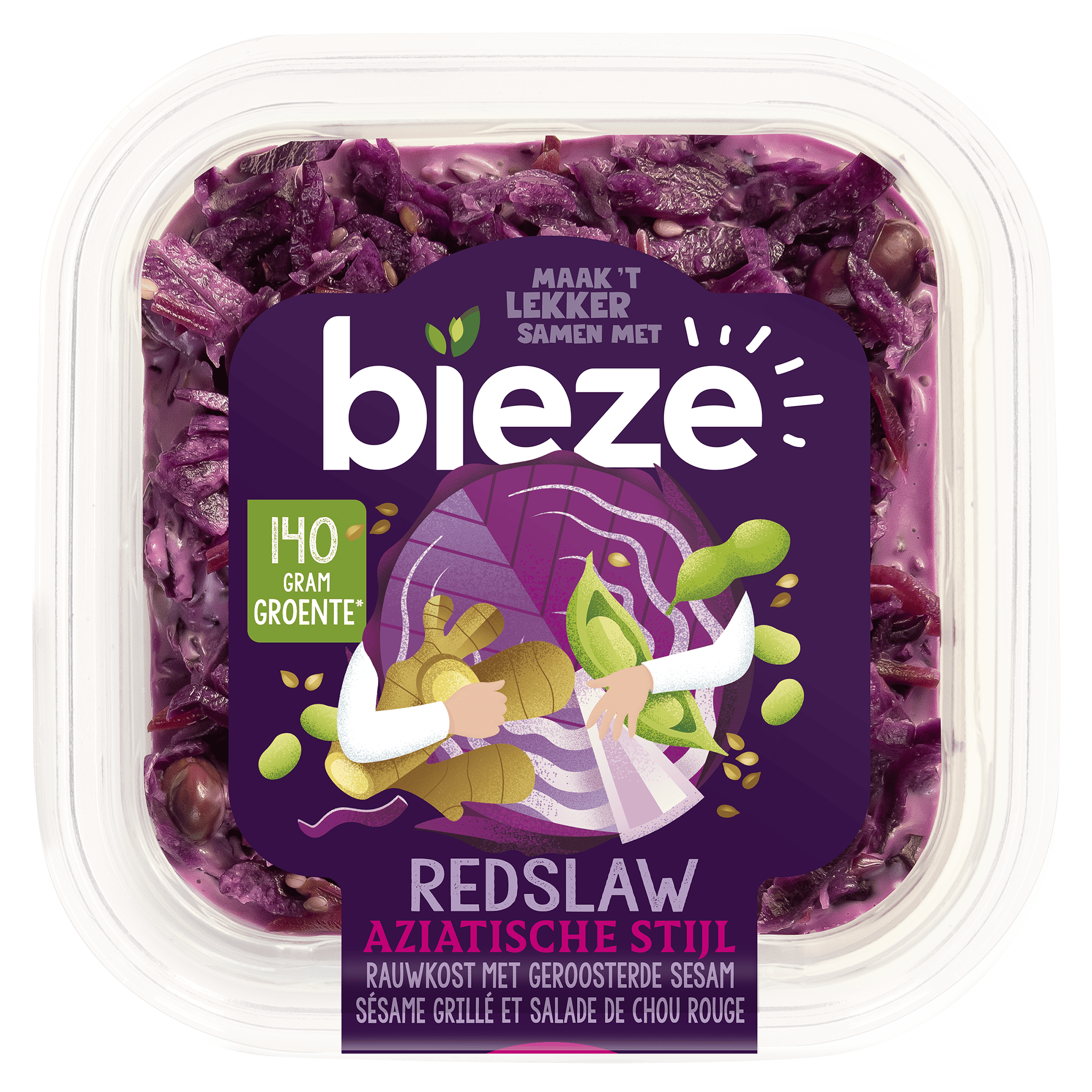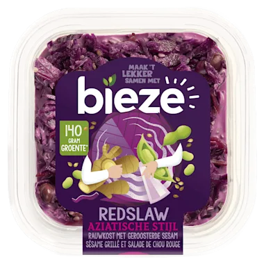 Ingrediënten: rode kool (39%), raapolie, water, wortel (9%), edamame SOJAbonen (6%), SOJAsaus (water, SOJAbonen, zout, alcoholazijn), suiker, ui (2%), geroosterde SESAMzaad (1%), rijstazijn, gember, alcoholazijn, gemodificeerd maiszetmeel, maiszetmeel, geroosterde SESAMolie, zout, conserveermiddel: E202/ E211, verdikkingsmiddel: E412/E415, MOSTERDzaad, dextrose, specerijen.