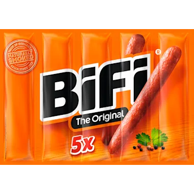 Gerookte droge worst. Bereid met 160 g varkens- en rundvlees per 100 g Bifi.