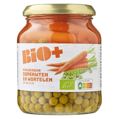 Ingrediënten :groenten in wisselende verhouding (doperwten*, wortelen*), water.
