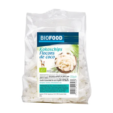 Kokoschips zijn chips die van kokosnoten worden gemaakt. Lekker om zo te eten, als gezonde vervanger van gewone chips of om toe te voegen aan yoghurt, een smoothie of salade. Biologisch!