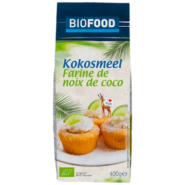 kokosmeel*. *Van gecontroleerde biologische teelt. Kan GLUTEN en SOJA bevatten.