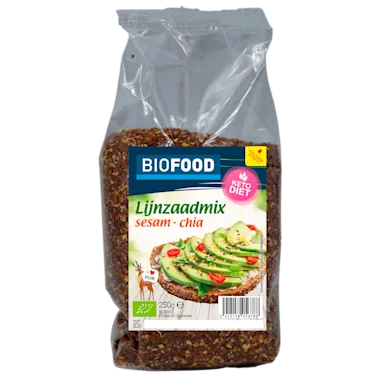 Deze bio vezelrijke lijnzaadmix sesam-chia, kan u aan verschillende gerechten toevoegen. Ook past deze mix perfect in het keto dieet.