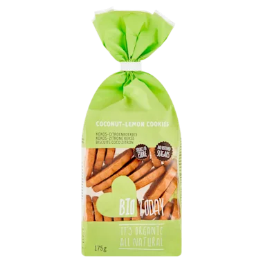 Ingrediënten: TARWEbloem*, palmolie RSPO* (ongehard), rijststroop*, kokos rasp* 11%, volkoren TARWEmeel*, maismoutstroop*, GERSTEmeel*, boekweitmeel*, ahornsiroop*, GERSTEmoutstroop*, rijsmiddel: natriumbicarbonaat, citroenolie* <lt/>1%, *=biologisch Kan sporen bevatten van: andere glutenbevattende granen, noten, sesamzaad.