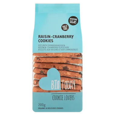 Ingrediënten: Volkoren TARWEmeel*, rozijnen* 20%, palmolie*(ongehard), HAVERvlokken*, maïsmoutstroop*, rijststroop*, appeldiksap*, dadelstroop*, gezoete en gedroogde cranberries* 3% (cranberries* 60%, appeldiksap*, zonnebloemolie*), GERSTEmoutstroop*, rijsmiddel: natrium bicarbonaat, kaneel*, zout, *=biologisch