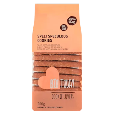 Ingrediënten: Volkoren spelt(TARWE)meel* 24%, palmolie* (ongehard), dadelstroop*, HAVERvlokken*, spelt(TARWE) bloem* 12%, maismoutstroop*, ROGGEmeel*, GERSTEmeel*, GERSTEmoutstroop*, speculoos kruidenmix* 1% (kaneel*, nootmuskaat*, kruidnagel*), rijsmiddel: natrium bicarbonaat, kardemom*, zout, *=biologisch