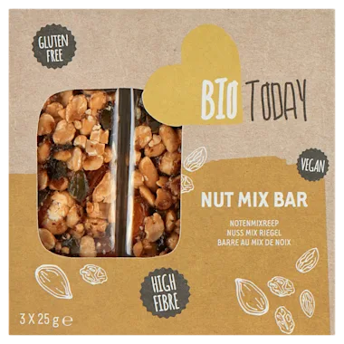 Ingrediënten: PINDA'S (AARDNOTEN)* 44%, AMANDELEN* 13%, rozijnen* (rozijnen*, zonnebloemolie*), pompoenpitten*, inuline*, rijstsiroop*, *=biologisch