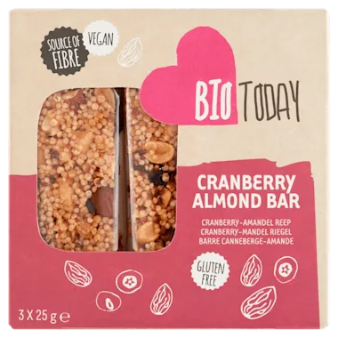 Ingrediënten: PINDA'S (AARDNOTEN)* 21%, AMANDELEN* 19%, rijstcrispies* (rijstmeel*), agavesiroop*, gedroogde en gezoete cranberry's* 14% (cranberry's* 60%, appelsapconcentraat*, zonnebloemolie*), rijstsiroop*, rozijnen* (rozijnen*, zonnebloemolie*), *=biologisch
