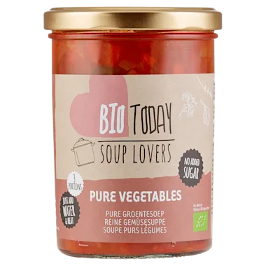 Ingrediënten: groenten* 75% (wortel* 20%, ui* 20%, bleekSELDERIJ* 10%, rode paprika* 9%, prei* 9%, erwten* 7%), water, tomatenpuree*, zonnebloemolie*, zeezout, olijfolie*, knoflook*, chilipoeder*, gistextract, zwarte peper*. *=biologisch. Kan sporen bevatten van glutenbevattende granen, vis, pinda’s (aardnoten), soja, melk, noten, mosterd.