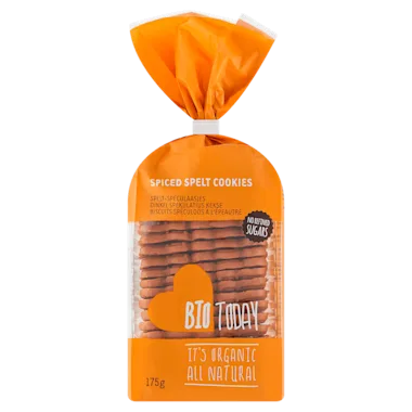 Ingrediënten: Spelt(TARWE)bloem* 47%, palmolie RSPO* (ongehard), maismoutstroop*, dadelstroop*, volkoren spelt(TARWE)meel* 11%, GERSTEmoutstroop*, speculaaskruiden* 1% (kaneel*, nootmuskaat*, kruidnagel*), appeldiksap*, rijsmiddel: natriumbicarbonaat, kaneel*, zout, kardemom*, *=biologisch
