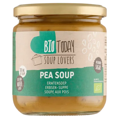 Ingrediënten: Spliterwten* 30%, water, ui*, knolSELDERIJ*, prei*, aardappel*, wortel*, doperwten* 4,6%, zeezout, maïszetmeel*, gist*, SELDERIJblad*, *= biologisch.