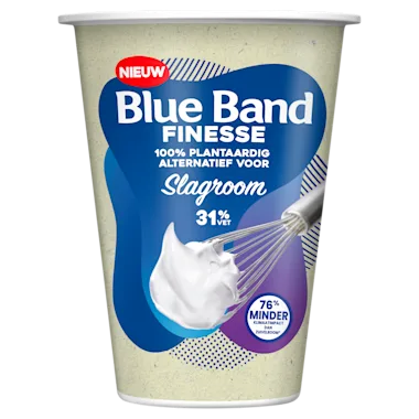 Een mix van linzeneiwit en plantaardige vetten en oliën (31%). Voor koken en kloppen.