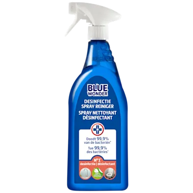 Blue Wonder Desinfectie Spray Reiniger is een unieke reiniger. Deze unieke reiniger desinfecteert en reinigt in één. Deze desinfectiereiniger doodt 99,9% van de bacteriën, verwijdert effectief vuil en heeft een frisse geur. Blue Wonder Desinfectie Spray Reiniger is ideaal voor dagelijks gebruik in huis. Geschikt voor bijvoorbeeld aanrecht, toilet, deurklinken, kranen, meubilair, vloeren, telefoons, speelgoed en nog veel meer. Blue Wonder Desinfectie Spray Reiniger is 100% plant-based en biologisch afbreekbaar.