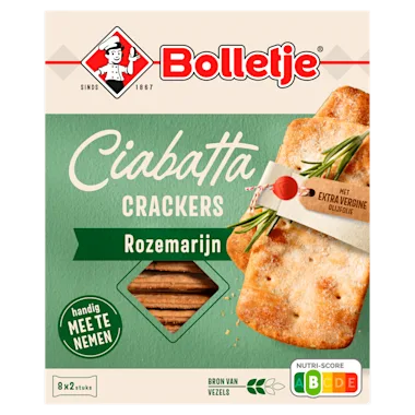 handig MEE TE NEMEN / Met extra vergine olijfolie / Onze Ciabatta Crackers zijn lekker luchtig en knapperig, we bakken ze prachtig goudbruin. Ze zijn vol van smaak door de fijnste bloem, extra vergine olijfolie, geurende rozemarijn en een snufje zout. Handig per twee verpakt, dus ideaal voor onderweg. / Kijk voor meer allergeneninformatie op www.bolletje.nl.