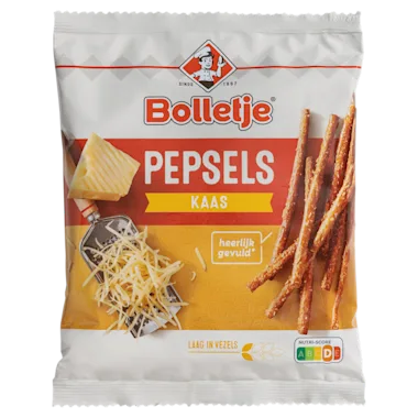 Laag in vezels / Wij staan voor bakmanschap. Dat is bakken met hart, ziel en mooie ingrediënten. De Pepsels zijn ovengebakken en daardoor extra knapperig. Deze Pepsels zijn bestrooid met kaas en heerlijk gevuld. Daar hebben de bakkers van Bolletje wel kaas van gegeten!