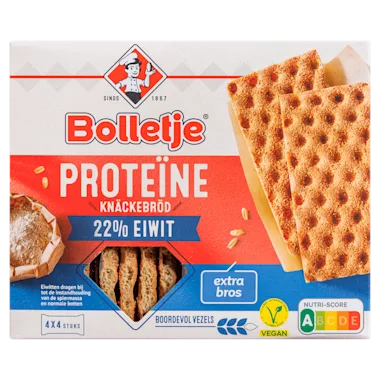 22% Eiwit / De eiwitten in één knäckebröd dragen al bij tot de instandhouding van de spiermassa en normale botten. Voor een gezonde leefstijl is het belangrijk om voldoende te bewegen en gevarieerd te eten. / Bolletje Proteïne Knäckebröd is extra bros en luchtig gebakken. Door de toevoeging van pompoenpitmeel bevat het 22% eiwitten en zit ook nog eens boordevol vezels! / Kijk voor meer allergeneninformatie op www.bolletje.nl./ Bolletje knäckebröd is bereid met ingrediënten van natuurlijke oorsprong. Het bevat dus geen kunstmatige kleur-, geur- en smaakstoffen.