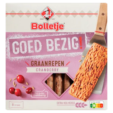 Deze graanrepen zijn lekker knapperig gebakken en bevatten extra veel vezels. Door er stukjes cranberry aan toe te voegen, krijgen de repen een heerlijk frisse fruitsmaak. Nu kun je nog even lekker door met goed bezig zijn! / Kijk voor meer allergeneninformatie op ww.bolletje.nl.