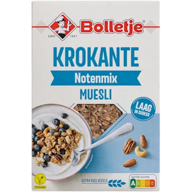 Laag in suiker / Extra veel vezels / Wij bakken graag de allerbeste producten. En… wij zorgen ervoor dat heel goed ook echt heel lekker is. Het liefst met zo min mogelijk suikers en zoveel mogelijk knapperigheid en smaak! Bolletje Krokante Muesli bevat de lekkerste granen, vol smaak in krokante stukken gebakken. Heerlijk knapperig en toch laag in suiker. Met de lekkerste amandelen, cashew- en pecannoten en een vleugje cacao. Zonder onnodige toevoegingen en het bevat extra veel vezels, dus lekker voedzaam./ Kijk voor meer allergeneninformatie op www.bolletje.nl.