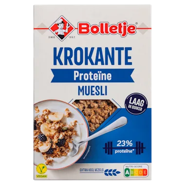 Laag in suiker / Extra veel vezels / 23% proteine* / *De eiwitten in een portie krokante proteïne muesli dragen al bij tot de instandhouding van de spiermassa en normale botten. Voor een gezonde leefstijl is het belangrijk om voldoende te bewegen en gevarieerd te eten. / Wij bakken graag de allerbeste producten. En… wij zorgen ervoor dat heel goed ook echt heel lekker is. Het liefst met zo min mogelijk suikers en zoveel mogelijk knapperigheid en smaak! Bolletje Krokante Muesli is heerlijk knapperig, maar toch laag in suiker.