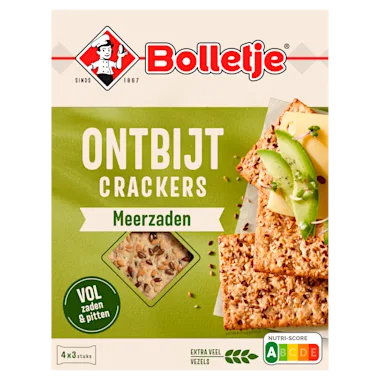 Vol zaden & pitten / Deze Ontbijtcrackers zijn stevig en bevatten extra veel vezels, dit maakt ze heerlijk voedzaam. De rijke bestrooiing van lijnzaad, sesamzaad, zonnebloempitten en pompoenpitten geeft ze lekker veel smaak. Zo zorgen we voor een goede start van je dag! / Kijk voor meer allergeneninformatie op www.bolletje.nl.