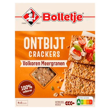 100% volkoren / Deze Ontbijtcrackers zijn lekker stevig en gemaakt van 100% volkoren granen; spelt, tarwe en havermout. Dit zorgt ervoor dat de crackers extra veel vezels bevatten en het maakt ze ook nog eens extra lekker! Zo zorgen we voor een goede start van je dag! / Kijk voor meer allergeneninformatie op www.bolletje.nl.
