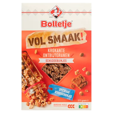 Wij staan voor bakmanschap. Dat is bakken met hart, ziel en mooie ingrediënten. Zo bakken we voor onze ontbijtgranen heerlijke speculaaskruiden met de granen mee. Dit zorgt voor smaak in elke hap! De Vol Smaak! Ontbijtgranen zijn al lekker van zichzelf en voor een extra volle smaakbeleving voegen we heerlijke Schuddebuikjes Speculaas toe. Bovendien zitten ze boordevol vezels en dat maakt ze lekker voedzaam! / Kijk voor meer allergeneninformatie op www.bolletje.nl.