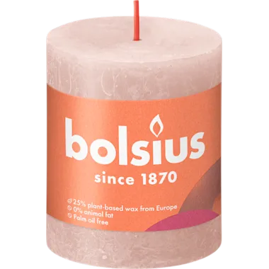 Make every moment a special one! The natural light of candles brings a unique warmth and ambience into your home and makes it cosy. Bolsius's rustic pillar candle coming in the light pink tone. Misty Pink boasts a full 8cm in height and burns for a good 35 hours. Made without palm oil, using natural vegan wax - with love for people and planet. Bolsius's collection includes rustic candles in different sizes and in 23 trendy colours, all of which go really well with each other.