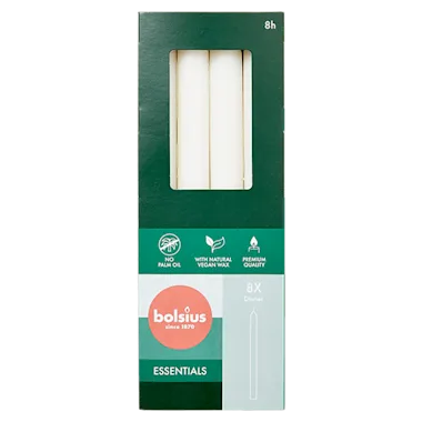 Ontdek de Essentials-collectie, de gladde tafelkaarsen van Bolsius! Deze dinerkaars in de kleur Cloudy White is 23 cm hoog en is tot 8 uur lek- en walmrij dankzij onze MaxAmbiance-technologie. Deze technologie combineert een uniek recept met een speciaal geselecteerde lont voor perfecte brandprestaties. En dankzij de gemakkelijk passende vorm past de kaars in bijna elke kandelaar. Gemaakt met 25% natuurlijke veganistische wax en zonder palmolie. De collectie omvat elegante kaarsen in verschillende maten en kleuren, die moeiteloos met elkaar kunnen worden gecombineerd. Een waardevolle toevoeging voor elk interieur!