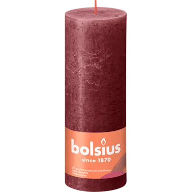 Make every moment a special one! The natural light of candles brings a unique warmth and ambience into your home and makes it cosy. Bolsius's rustic pillar candle coming in the burgundy tone Velvet Red boasts a full 19cm in height and burns for a good 85 hours. Made without palm oil, using natural vegan wax - with love for people and planet. Bolsius's collection includes rustic candles in different sizes and in 26 trendy colours, all of which go really well with each other.