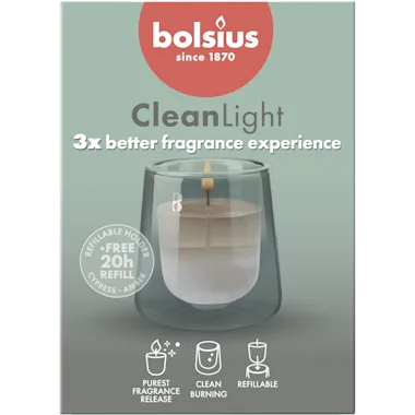 De CleanLight starterkit bevat een handgeblazen glazen houder en de navulbare geurkaars 'Cypress & Amber'. Het unieke ontwerp van de dubbelwandige houder zorgt ervoor dat er geen waxresten achterblijven én creëert een onweerstaanbare geurbeleving. Verwijder simpelweg het lontplaatje na het branden en vul bij met een van onze magische geurcombinaties. Minimum afval, maximaal genieten!