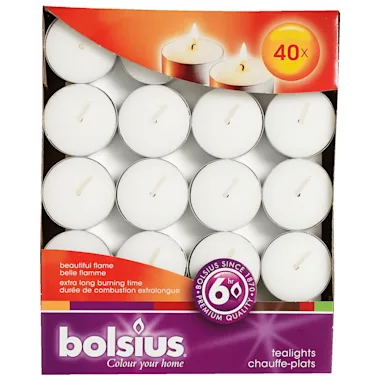 Met waxinelichtjes haal je gezelligheid in huis! Deze Bolsius theelichten in doos van 40 stuks hebben een lange brandduur, tot wel 6 uur. Elke Bolsius kaars is gemaakt met vakmanschap en met oog voor kwaliteit. Hierdoor roeten de waxinelichtjes niet en ontstaat er geen walm of rook wanneer je ze brandt. Het katoenen lontje, ook wel kaarsenpit genoemd, is zo gevlochten dat je altijd een stabiele vlam hebt. De theelichtjes zijn niet alleen functioneel maar geven ook sfeer als je ze in een leuke waxinelichthouder zet. Geniet van de magie van natuurlijk licht.