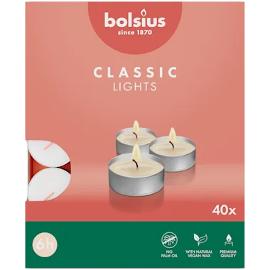 Met waxinelichtjes haal je gezelligheid in huis! Deze duurzamere Bolsius theelichten met zilveren cupje in een doos van 40 stuks branden tot wel 6 uur. Gemaakt met vakmanschap én liefde voor mens en planeet. Zonder palmolie, met natuurlijke vegan wax en in een recyclebare doos en cup. Met de theelichtjes voeg je niet alleen extra sfeer en warmte toe aan je interieur, maar geef je je tafel of dressoir een extra touch door ze te combineren in verschillende waxinelichthouders. Geniet van de magie van natuurlijk licht.