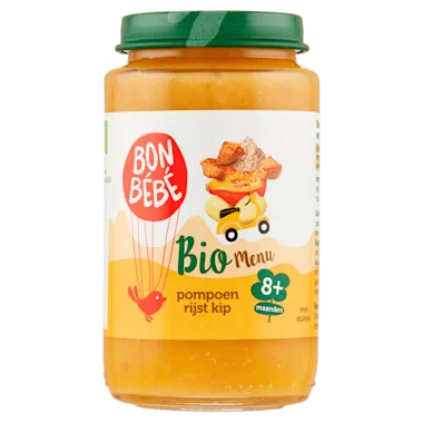 Biologische babyvoeding met pompoen, rijst en kip, vanaf 8 maanden