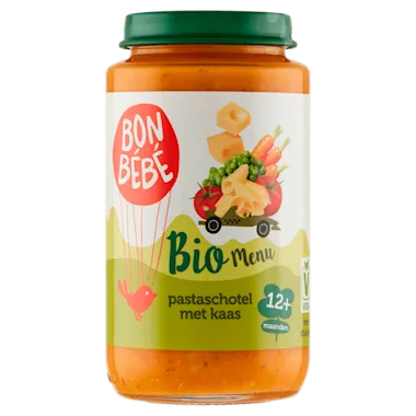 Ingrediënten :43% groenten (70% wortel*, 12% doperwten*, 12% tomaat*, 7% maïs*), water, 18% gekookte volkorenpasta (water, volkoren TARWEGRIESMEEL*), 4% kaas* (MELK), raapzaadolie*, oregano*, basilicum*, zwarte peper*.