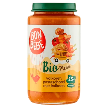 Biologische babyvoeding met volkorenpasta en kalkoen, vanaf 15 maanden