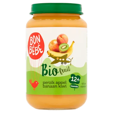 Biologische babyvoeding perzik appel banaan kiwi, vanaf 12 maanden.