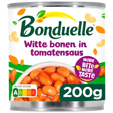 Ingrediënten: Witte bonen 49%, water, dubbelgeconcentreerde tomaten 7,1%, half ingekookte tomatenpuree 3,1%, suiker, rode wijnazijn, zout, alcoholazijn, natuurlijke aroma's, gistextract, natuurlijk aroma van uien met andere natuurlijke aroma's. Kan SOJA bevatten.