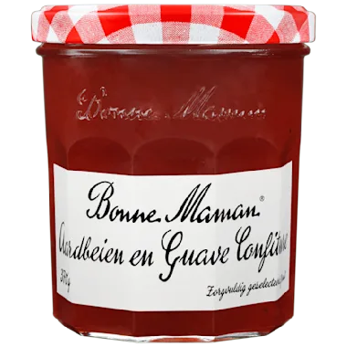 ingrediënten: vruchten (aardbeien 32%, guaves 18%), suiker, bruine rietsuiker, geconcentreerd citroensap, geleermiddel: pectinen