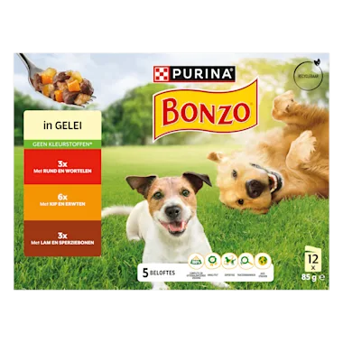 Voedingsadvies: *Berekend op basis van PURINA® BONZO® Menu Brokken droogvoeding. Deze hoeveelheden zijn gemiddelden gebaseerd op matig actieve honden bij normale omgevingstemperaturen. Individuele behoeften variëren en de hoeveelheid voeding moet daarop aangepast worden. Zorg dat er altijd schoon en vers drinkwater klaarstaat. Alleen maaltijdzakjes Natvoer zakjes + Droogvoer*Natvoer zakjes + Droogvoer*. Verwacht lichaamsgewicht volwassen hond (in kg) Nat (maaltijdzakjes) Natvoer(maaltijdzakjes per dag) Droog (g per dag)