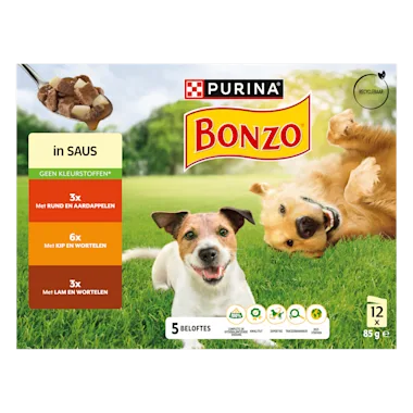 Bonzo® 5 Beloftes. Vanaf de dag dat je jouw hond mee naar huis bracht, ben je een verbintenis aangegaan. De belofte om voor hem te zorgen, hem goed te voeden en hem te helpen een gelukkig en gezond leven te leiden, vol vitaliteit en dagelijks geluk bij je thuis te brengen. Met tientallen jaren ervaring en expertise voedt Bonzo® al generaties lang blije en gezonde honden met zijn smakelijke en kwalitatieve voeder voor elke dag. Met die eer komt een grote verantwoordelijkheid. En net als jij, doen wij allemaal bij Bonzo® ons best om te doen wat we zeggen. Voor je hond, en voor jou.