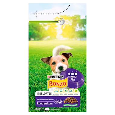 PURINA® Bonzo® Mini Menu met een smakelijke mix van Rund en Lam is een heerlijk recept met rund en lam, gecombineerd met volkoren granen, B vitaminen en Omega 3&6 vetzuren. Bonzo® Mini Menu, een heerlijke maaltijd met kleinere brokjes speciaal ontwikkeld voor jouw kleine hond. het is 100% volledig en gebalanceerd en gemaakt met kwalitatief hoogwaardige ingrediënten en vezels voor een gezonde spijsvertering.