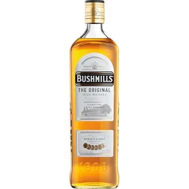 Ireland's oldest whiskey distillery. Ireland's oldest whiskey distillery. Original grant to distil 1608. A blend of 100% irish whiskeys. Triple distilled. Smooth & mellow. Award winning flavour and quality. Distilled, matured and bottled by the "old bushmills" distillery co. Product of ireland. Trade genuine. Mark quality. Finest blended irish whiskey.