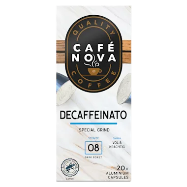 Café Nova Decaffeinato Special Grind. Sterkte 08 Dark Roast. Smaak Vol & Krachtig. Café Nova koffie wordt met vakmanschap en liefde samengesteld en gebrand. De bonen voor deze capsules worden in 4 stappen fijngemalen zodat de koffie in de machine optimaal zijn aroma kan afgeven. De melanges van Café Nova zijn door onze meesterproever zo ontwikkeld zodat je thuis een koffie zet, zoals je 'm bij de beste koffiebar geserveerd krijgt. Melange: 100% Arabica. Branding: dark roast. Sterkte: 8/12. Smaak: vol en krachtig - hazelnoot, cederhout. Ideaal voor: krachtige espresso of lungo